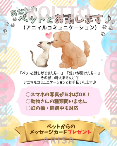 | 10 | アニマルコミュニケーションARISA![]() | 飼っているペットの気持ちを聞いてみませんか? |